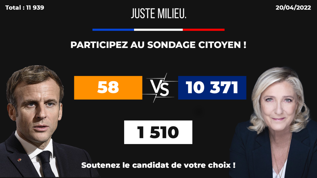 Eh oui. Les résultats du sondage proposé par Juste Milieu reflète le penchant de ses abonnés et ceux qui le suivent et n’est pas représentatif de la totalité des français. Une leçon à retenir pour ne pas être déçu(e) par la suite des évènements. Et surtout penser qu’en juin il y a les législatives qui servent aussi à créer un contre pouvoir. Le mot d’ordre quoiqu’il advienne : prendre son destin en main et aller voter. Bonne journée à tous.