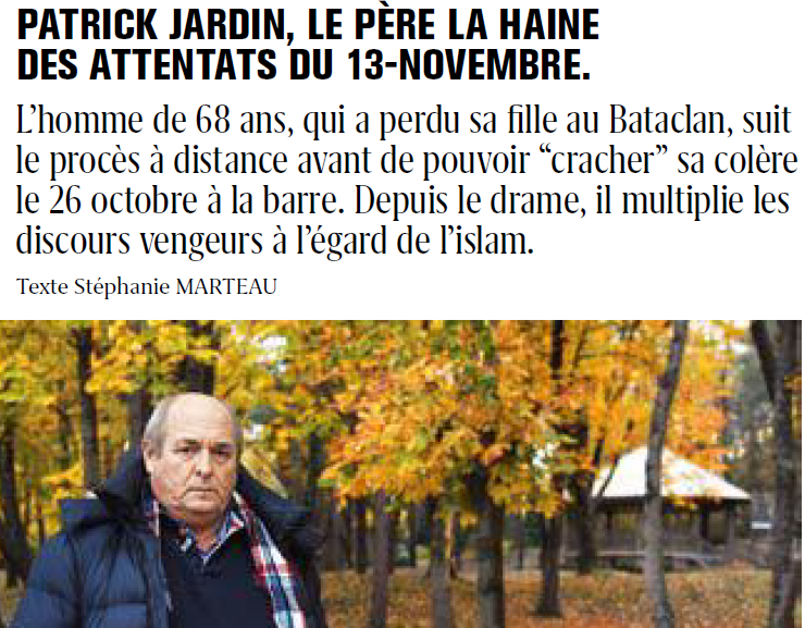 Au sujet de Georges Salines, père de victime qui a écrit un bouquin avec Azdyne Amimour, père de terroriste, Patrick Jardin déclare : « Ça me dégoûte de les voir se prosterner comme ça. Moi, je suis incapable de pardon, et je refuse de baisser la tête ».